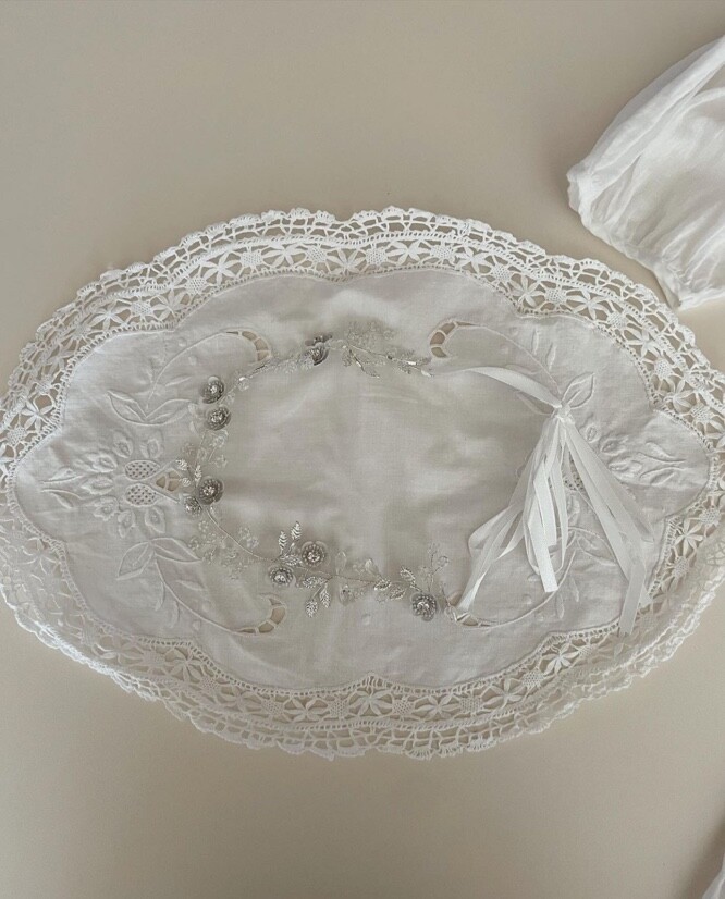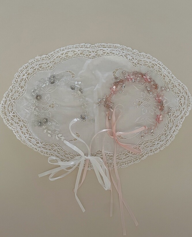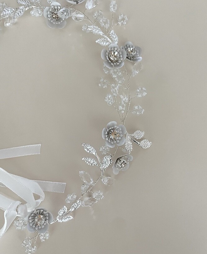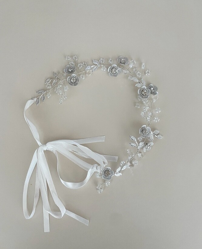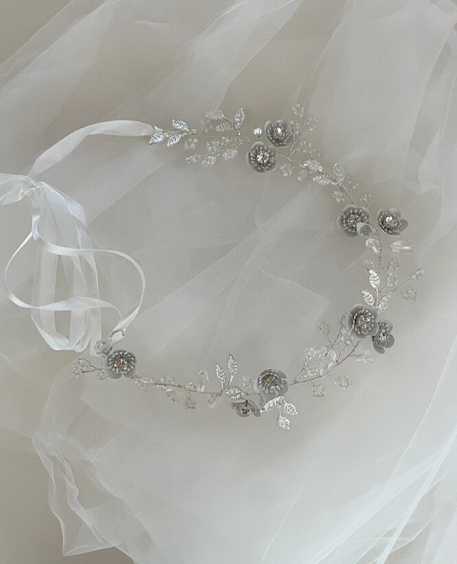 백색과 실버, 투명비즈가 어우러진 고급스러운 화관입니다.